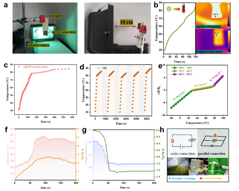 由于对太阳光谱的广泛吸收和局部表面等离子体共振(LSPR)效应,银纳米材料表现出很高的光热转换性能,这有望实现对太阳能的高效利用。在250 W紫外灯照射下(d= 15 cm),AgNW/棉织物的表面温度迅速上升,在146s时达到86.2℃的饱和温度并保持稳定,而原棉织物在相同的照射时间内仅达到32.4℃。与原棉织物相比,AgNW/棉织物具有明显的光热转化性能,约为原棉织物的2.66倍。在恒定的照射强度下,经历重复多次光照-冷却过程的AgNW/棉织物再次通过光热转换达到的饱和温度值基本保持不变,显示了该器件作为可穿戴加热器的加热稳定性、可调节性和安全稳定性。
