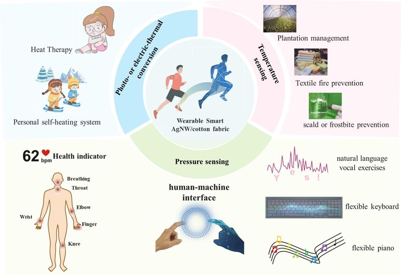 近日,生态染整团队邢铁玲教授、陈国强教授团队以生物质咖啡酸为还原剂和锚定剂,以聚乙烯吡咯烷酮(PVP)为模板剂,室温下在棉织物表面原位生成直径为40~60nm、长度为40~60μm的高长径比AgNWs。所制备的柔性AgNW/棉织物方块电阻为0.23Ω/sq,具有优异稳定的导电性能以及良好的物理性能。此外,AgNW/棉织物在能量转换、压力/温度传感和电磁屏蔽等方面也表现出优秀的应用潜力,有望用于灵活、透气、多功能柔性可穿戴器件领域。