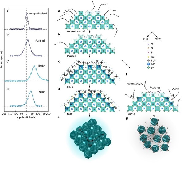 Lead halide perovskite semiconductors are well-suited to applications such as solar cells and LEDs in view of their high defect tolerance, high carrier mobility and tunable emission over the visible and NIR ranges. QDs based on perovskites have emerged as promising materials in view of their high luminescence efficiency and narrow emission linewidth. Quantum confinement increases the binding energy of excitons, improving PLQY and positioning this material for use in next-generation LEDs. The PLQY was increased by nanosized grains (>100 nm); yet to take advantage of quantum confinement, it is necessary to bring the nanoparticle diameter into the range of the Bohr exciton radius, ~ 6-8 nm in the case of cesium and formamidinium lead halide perovskites. In addition to improving the PLQY, quantum confinement offers an additional method, beyond anion substitution, to tune the emission wavelength. Since ion migration during device operation leads to phase segregated regions of the different halides, and this leads to redshift in the emission profile upon application of an operating bias, confinement-based size-tuning may be an important route to blue perovskite LEDs. However, managing colloidal stability and passivation while retaining confinement is a challenge specific to perovskite QDs. Perovskite QD surfaces are terminated with LH+X-ion pairs, where LH+represents the hydrated organic ligand and X-is a combination of long-chain carboxylate ligands and halide ions. The non-covalent ligand: surface bond in the case of perovskites results in dynamic ligand binding. The QD surface ions can be stripped off, along with the organic ligands, upon washing and drying (LH++Br-⇋L+HBr), destabilizing QD colloids and reducing the PLQY. When these QDs are cast into films, they tend to aggregate, losing PLQY and shifting in their emission wavelength.