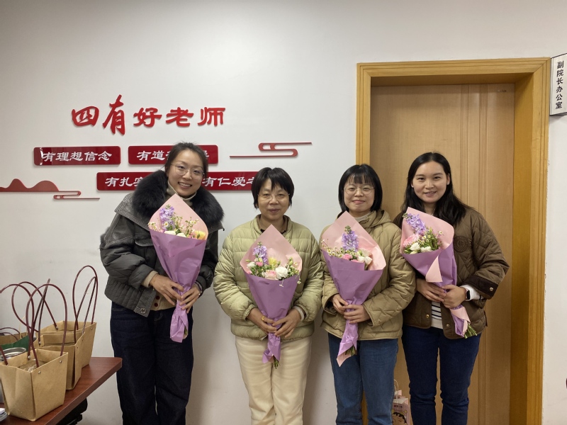 插花活动结束后,对于同一时间还在学院办公室加班的女教师,分工会送花到现场并进行了插花指导。