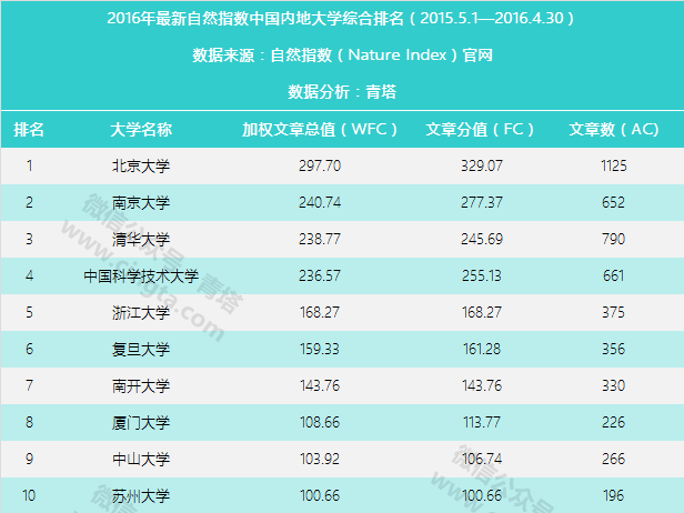 2016年度自然指数国内大学排行